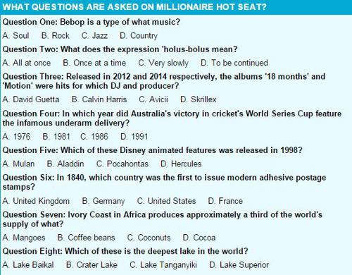 The questions covered everything from jazz music and African exports to cricket and Calvin Harris, with each one apparently stumping contestant Erin.
