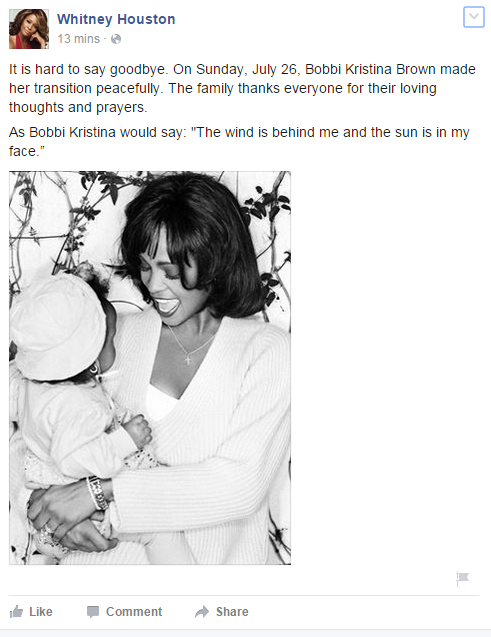 "She is finally at peace in the arms of God," the Houston family said in a statement.