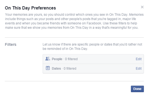 If you want to change the setting and block a sensitive date or person, just go to the “On This Day” page and click “Preferences” in the upper right-hand corner. Add the date or person you don’t want to see, and hit save.