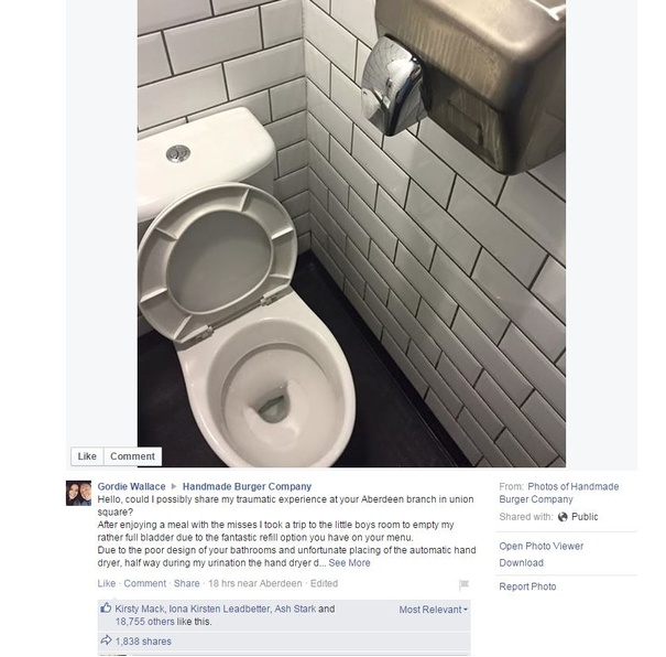 Gordie Wallace had just eaten at Aberdeen's Handmade Burger Company store when he visited the toilet. While he stood, the automatic hand dryer went off causing the phrase 'splashing out' to take on a new and unwelcome meaning.