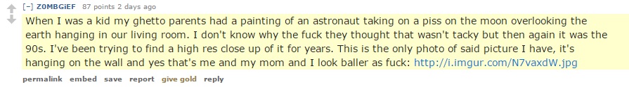 "VINDICATION AT LAST! The astronaut is indeed draining his lizard and no matter how much my family will try to deny it, I now have proof that at least at one point my mom had some pretty trashy ghetto taste for art. I can't for the life of me think how more no life the internet can truly be than bringing this mystery to a close at least for me. It cracks me up to think that this stupid coincidence spanned over 20 years, across two continents, from a shitty wallart choice circa 1990 to a no life computer nerd's server room in 2015. The interwebs is indeed a beautiful place. Now if you'll excuse me, I have to give my mother a ring."