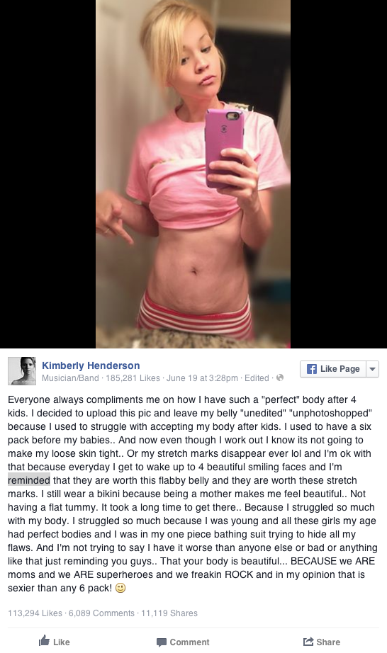Mother and musician Kimberly Henderson got over being told she had the "perfect body", so she took to Facebook to post a selfie which has gone viral.