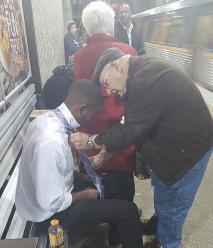 Thomas wrote: ‘The young guy sitting down was struggling with his tie. The woman in the red coat noticed, and asked “do you know how to tie it properly?” The young guy said “No ma’am”.