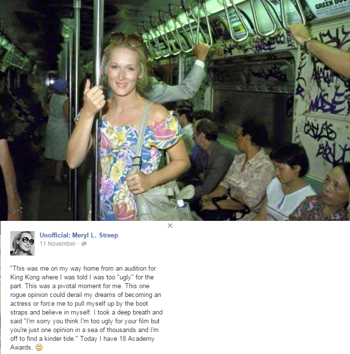 In fact, Meryl never actually said that. Nylon reported on the fake pic saying, “What many people are failing to realize, though, is that the photo and caption do not belong together. Sorry to be the bearer of bad news, but Meryl L. Streep is not actually Meryl Streep’s Facebook page. It’s a fan page and clearly states so in its About section.”