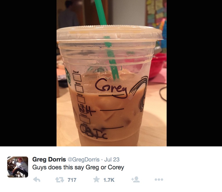 Any guesses? We're just gonna throw it out there that the owner of the cup is called Greg (Greg Dorris, to be exact, and he’s a writer for Jimmy Kimmel Live).  However, he’s not really sure if it says Greg or Corey, either.